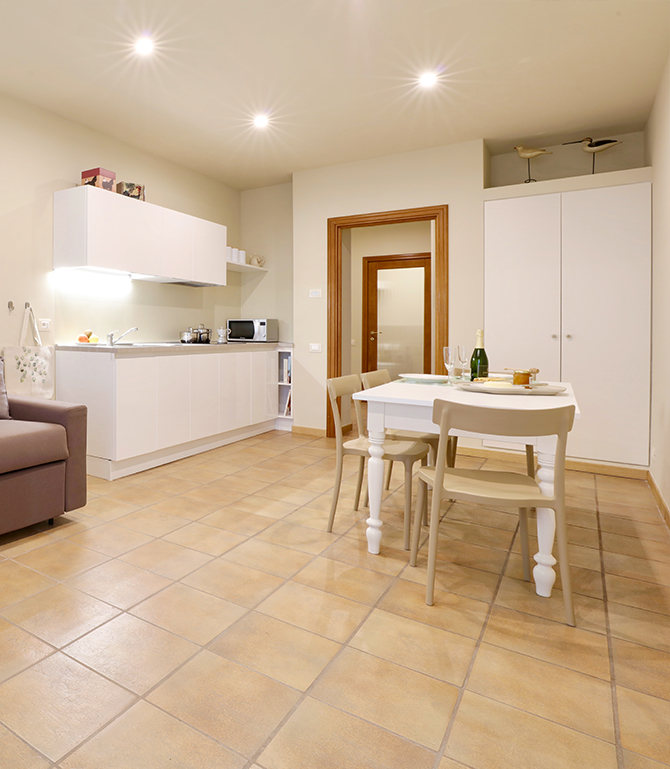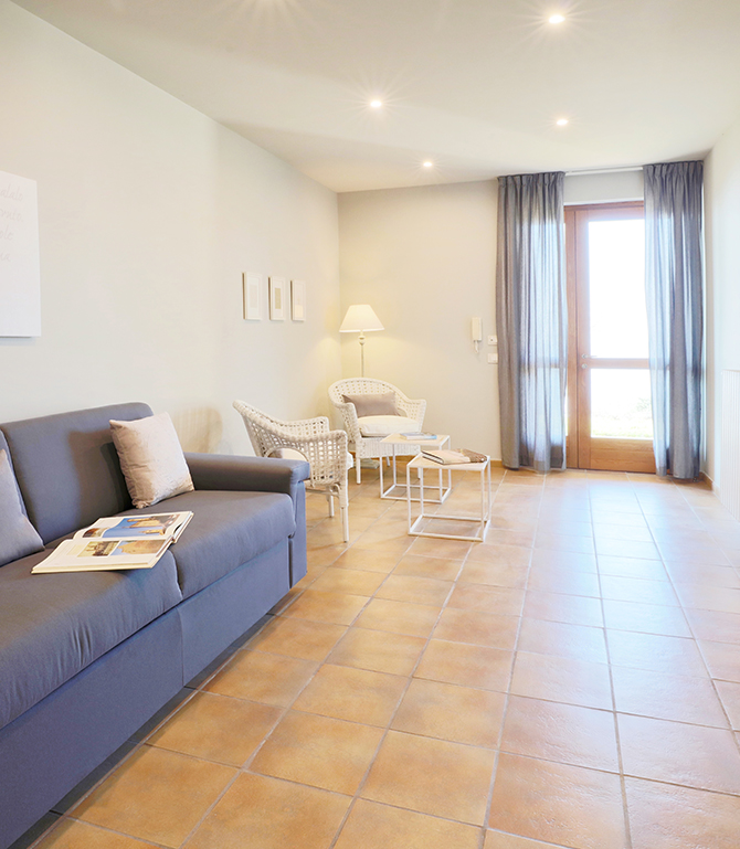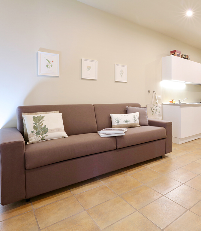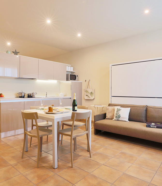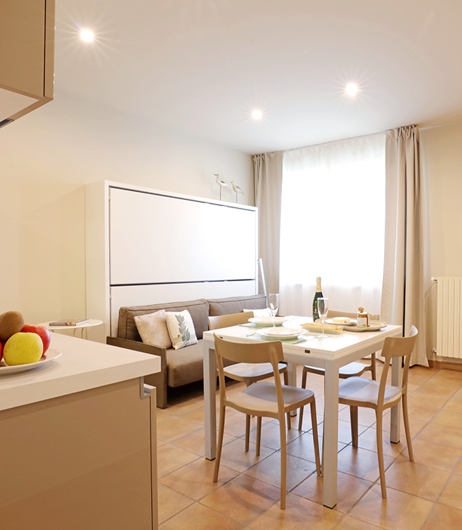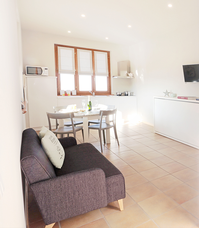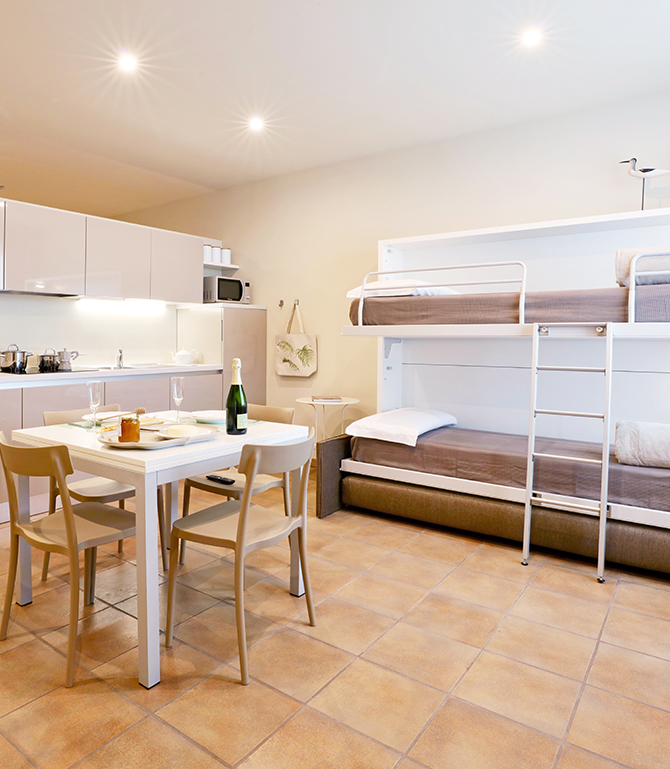 40 mq, 1 camera matrimoniale, ampia zona giorno con cucina attrezzata e divano trasformabile in letto a castello, 1 bagno con doccia e vasca idromassaggio, porticato con zona pranzo e relax.